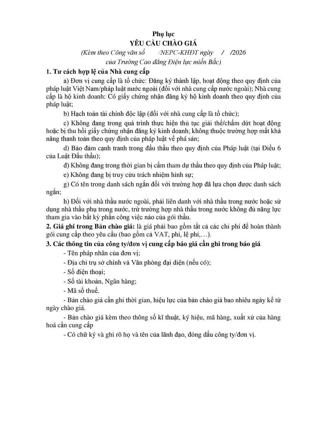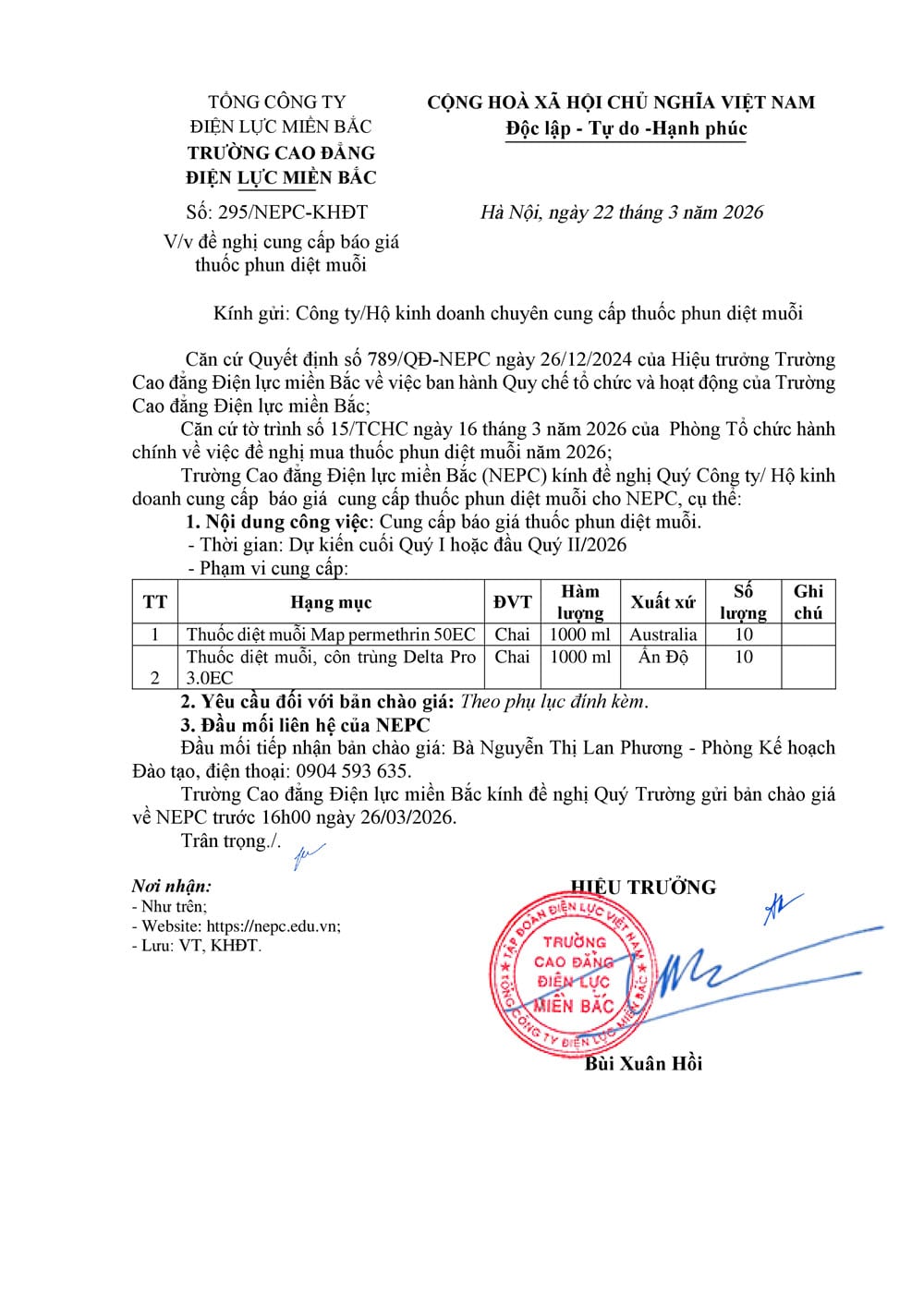 Tin TứcThông báoTin nhà trường CÔNG VĂN ĐỀ NGHỊ CUNG CẤP BÁO GIÁ THUỐC PHUN DIỆT MUỖI CHO NEPC 2026 Bởi Quang Thơm - 23/03/2026 0 36 Trường Cao đẳng Điện lực miền Bắc (NEPC) kính đề nghị Quý Công ty/ Hộ kinh doanh cung cấp báo giá cung cấp thuốc phun diệt muỗi cho NEPC, cụ thể như trong CV đính kèm: