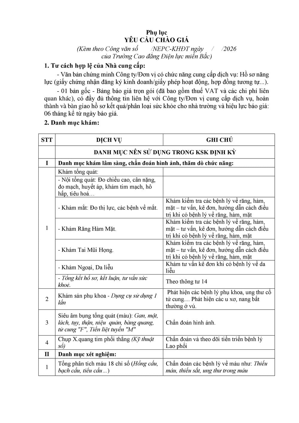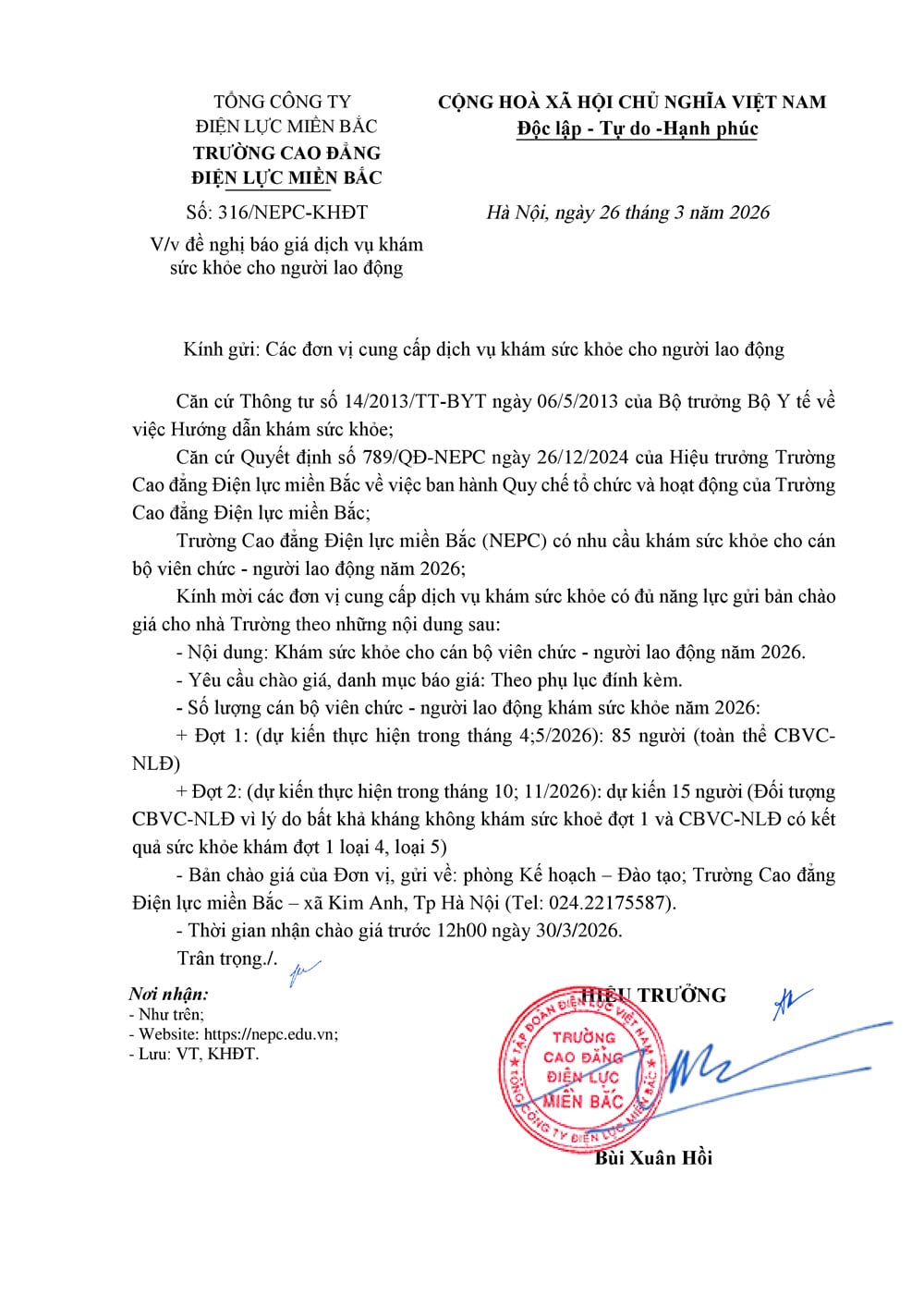 Chưa được phân loại CÔNG VĂN ĐỀ NGHỊ CUNG CẤP DỊCH VỤ KHÁM SỨC KHOẺ CHO NGƯỜI LAO ĐỘNG CỦA NEPC 2026 Bởi Quang Thơm - 26/03/2026 0 31 Trường Cao đẳng Điện lực miền Bắc (NEPC) kính mời các đơn vị cung cấp dịch vụ khám sức khoẻ cho người lao động của NEPC, cụ thể như trong CV đính kèm: