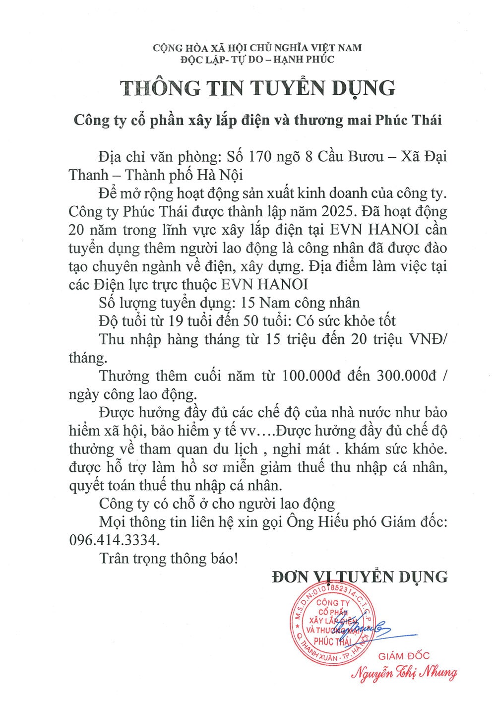 Tin TứcThông báoTin ngành điệnTin nhà trườngTin tuyển dụng CÔNG TY CỔ PHẦN XÂY LẮP ĐIỆN VÀ THƯƠNG MẠI PHÚC THÁI THÔNG BÁO TUYỂN DỤNG LAO ĐỘNG 2026 Bởi Quang Thơm - 18/03/2026 0 104 CÔNG TY CỔ PHẦN XÂY LẮP ĐIỆN VÀ THƯƠNG MẠI PHÚC THÁI THÔNG BÁO TUYỂN DỤNG LAO ĐỘNG 2026 – Mọi thông tin xin liên hệ: Ông Hiếu – Phó GĐ: 096.414.3334
