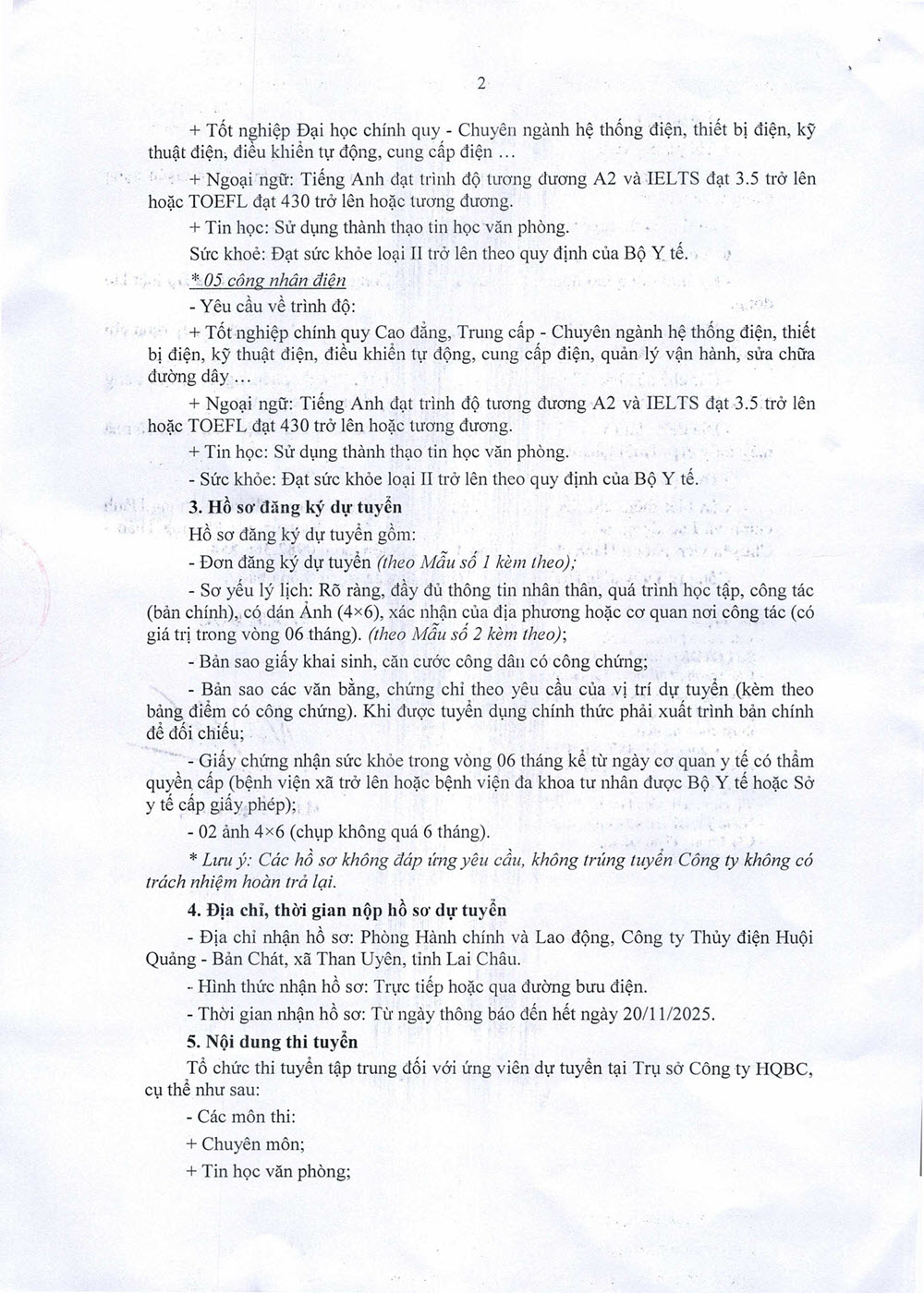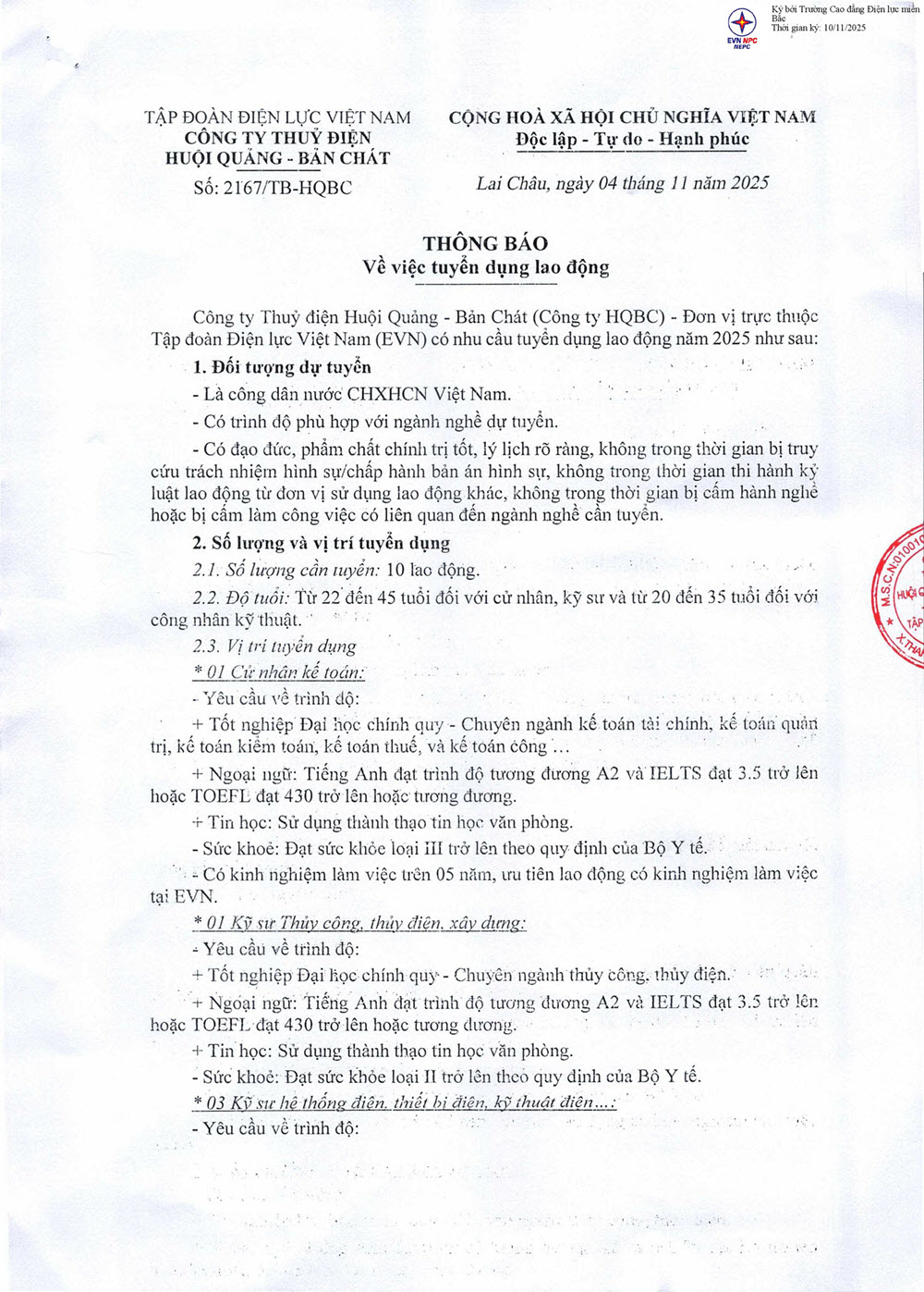 CÔNG TY THUỶ ĐIỆN HUỘI QUẢNG – BẢN CHÁT THÔNG BÁO TUYỂN DỤNG LAO ĐỘNG T11.2025