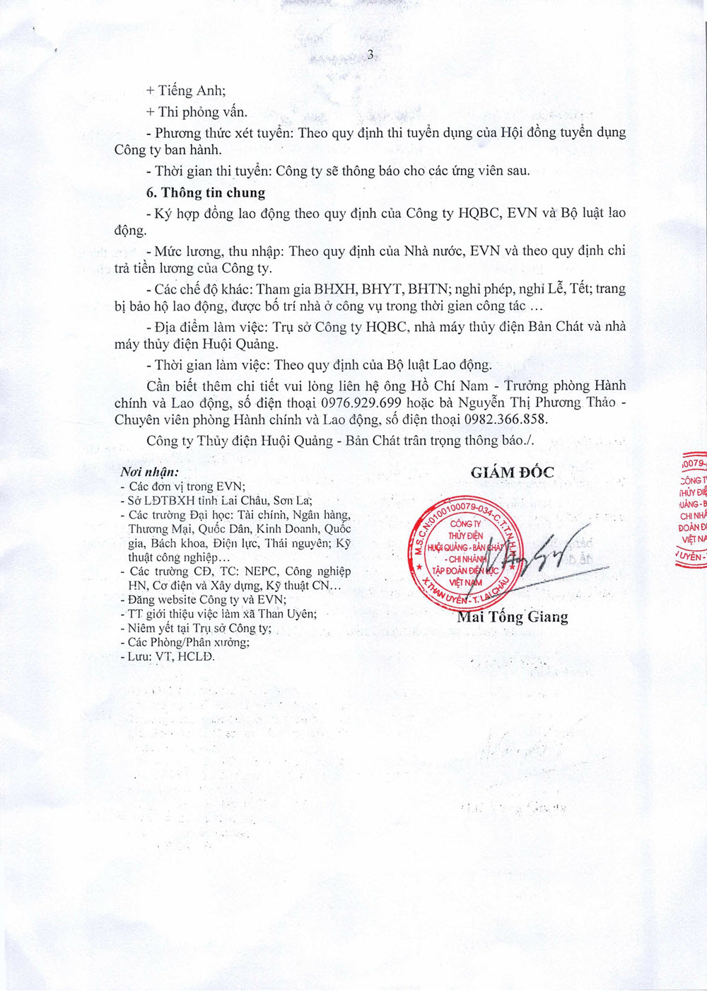 – Mọi thông tin xin liên hệ: Phòng Hành chính và Lao động  – Công ty Thuỷ điện Huội Quảng – Bản Chát