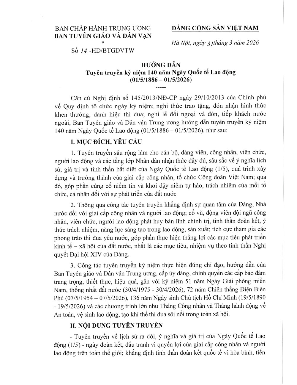 Công tác ĐảngTin TứcThông báoTin nhà trườngTuyên truyền HƯỚNG DẪN TUYÊN TRUYỀN KỶ NIỆM 140 NĂM NGÀY QUỐC TẾ LAO ĐỘNG 01/5 Bởi Quang Thơm - 20/04/2026 0 7