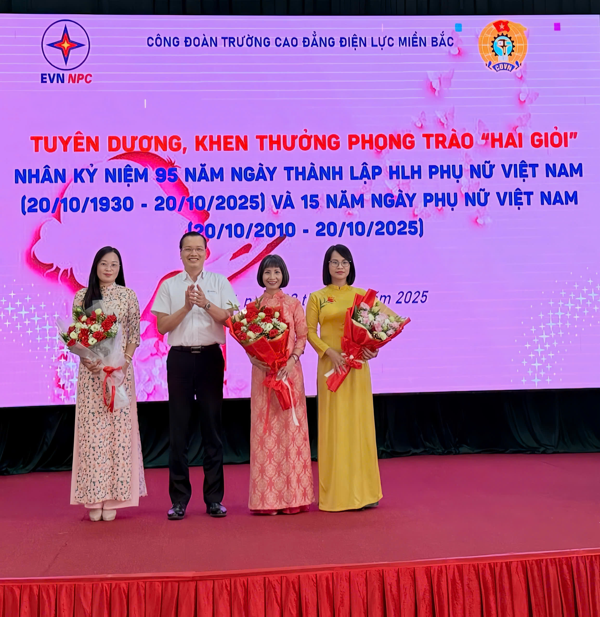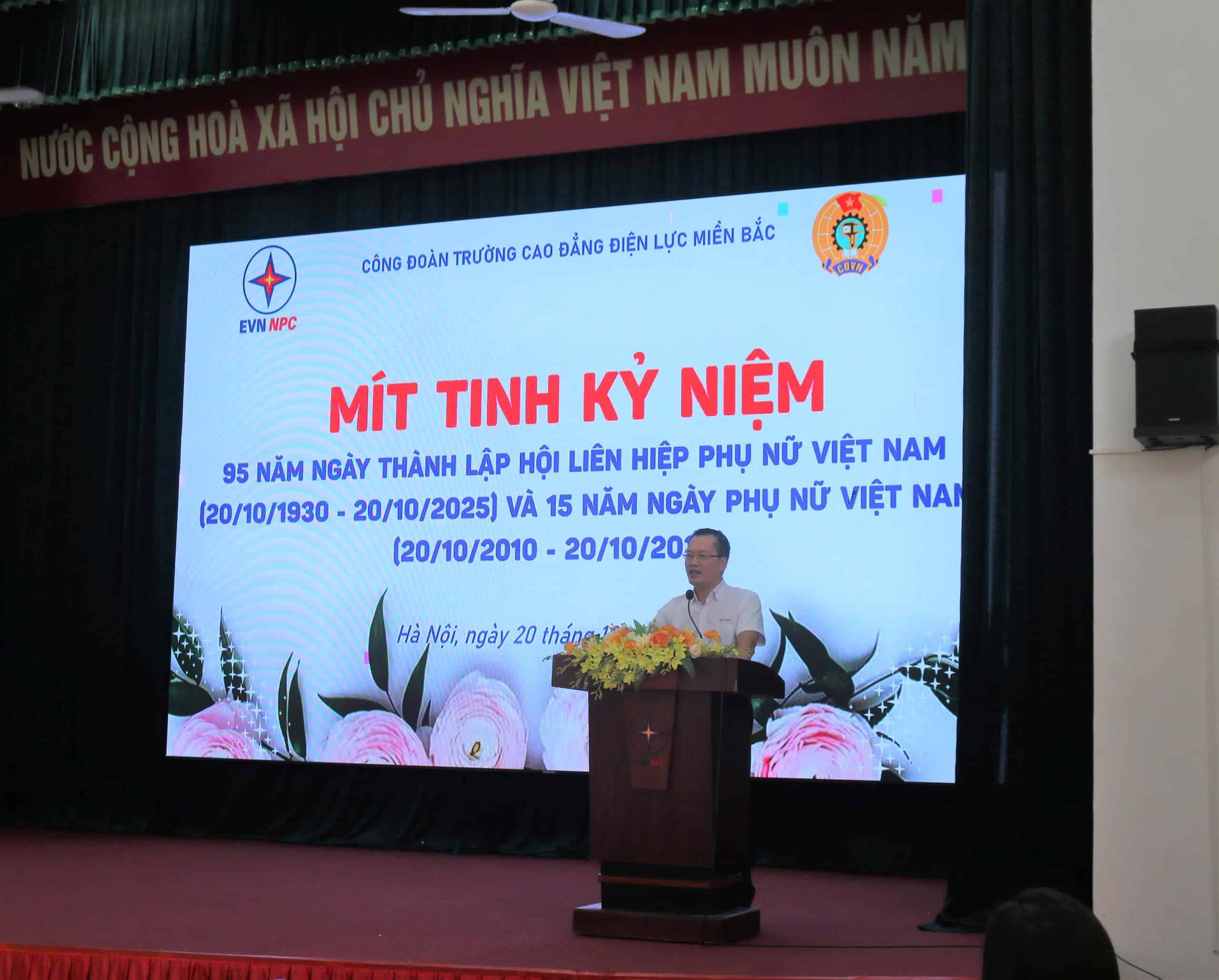 Trong không khí trang trọng và ấm áp, chiều ngày 20/10/2025, Trường Cao đẳng Điện lực miền Bắc (NEPC) đã long trọng tổ chức Lễ mít tinh kỷ niệm 95 năm ngày thành lập Hội Liên hiệp Phụ nữ Việt Nam (20/10/1930 – 20/10/2025) và 15 năm Ngày Phụ nữ Việt Nam (20/10/2010 – 20/10/2025). Buổi lễ là dịp để ôn lại truyền thống vẻ vang, ghi nhận và tôn vinh những đóng góp to lớn của đội ngũ nữ cán bộ, giảng viên, viên chức và người lao động nhà trường trong sự nghiệp giáo dục, đào tạo và phát triển chung của ngành Điện.