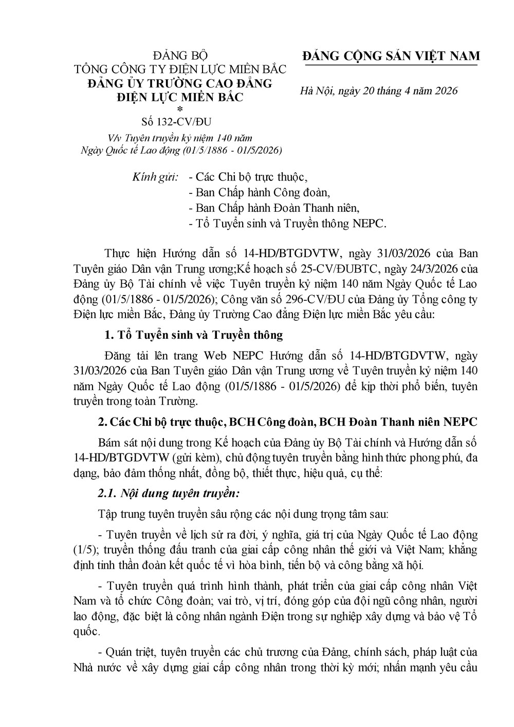 Công tác ĐảngTin TứcThông báoTin nhà trườngTuyên truyền NEPC TUYÊN TRUYỀN KỶ NIỆM 140 NĂM NGÀY QUỐC TẾ LAO ĐỘNG 01/5/1886-01/5/2026 Bởi Quang Thơm - 20/04/2026 0 6